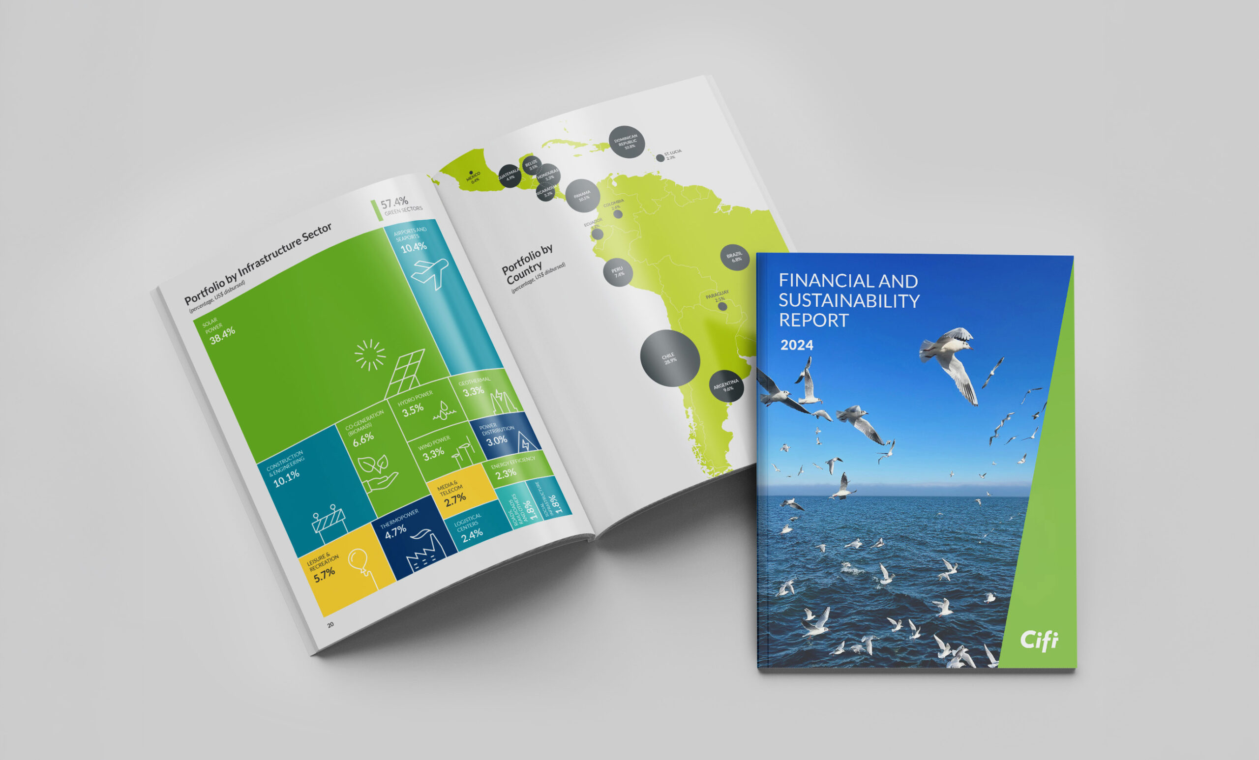 Bizarra desarrolló un concepto creativo limpio para el reporte sobre el Sustainable Infrastructure Debt Fund de CIFI, con una diagramación atractiva y un sólido trabajo de visualización de datos mediante tablas, gráficos e infografías. Además, realizó una cuidada curaduría de las fotografías utilizadas y trabajó, junto al equipo de CIFI, en la reescritura y edición en inglés del contenido de la publicación.